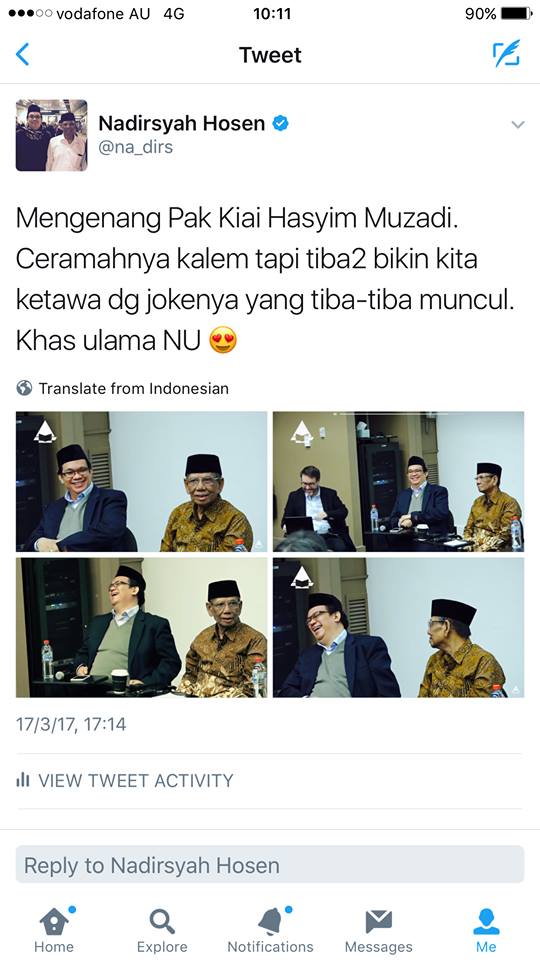 Pak Kiai Hasyim Muzadi (Allah yarham) kalau bicara pintar betul. Bicaranya kalem, tidak berapi-api, tapi khas ulama NU yang menyelipkan joke tanpa diduga dan membuat kita tertawa. Banyak jokenya yang bertebaran. Saya kutip sebagian: “Ilmu itu universal, bukan soal agama. Kristen belajar kedokteran ya jadi dokter. Orang NU gak belajar, ya jadi dukun.” Di sini…