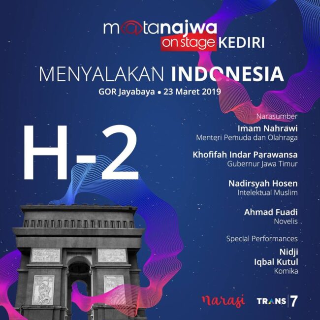 Semalam (23/3/19) acara #MataNajwaOnStageKediri luar biasa. Terima kasih atas kehadiran 5-6 ribu penonton yang meski menunggu lama dan hujan lebat tetap bertahan sampai selesai —plus sesi foto yg heboh banget. Saya mendapat kesempatan tampil bersama Mas Menteri Imam Nahrawi, Mbak Gubernur Khofifah dan penulis top Syekh A Fuadi, tentu bersama host Mbak Najwa Shihab. Acara akan ditayangkan…